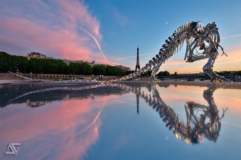 Artistul Philippe Pasqua a finalizat recent instalarea unui impresionant schelet de Tyrannosaurus Rex, care acum vegheaza peste râul Sena, în Paris. Structura este realizata din 350 de oase de metal, cromate și măsoară 3m x 6m. Fotografiile de mai jos sunt realizate de Anthony Gelot.