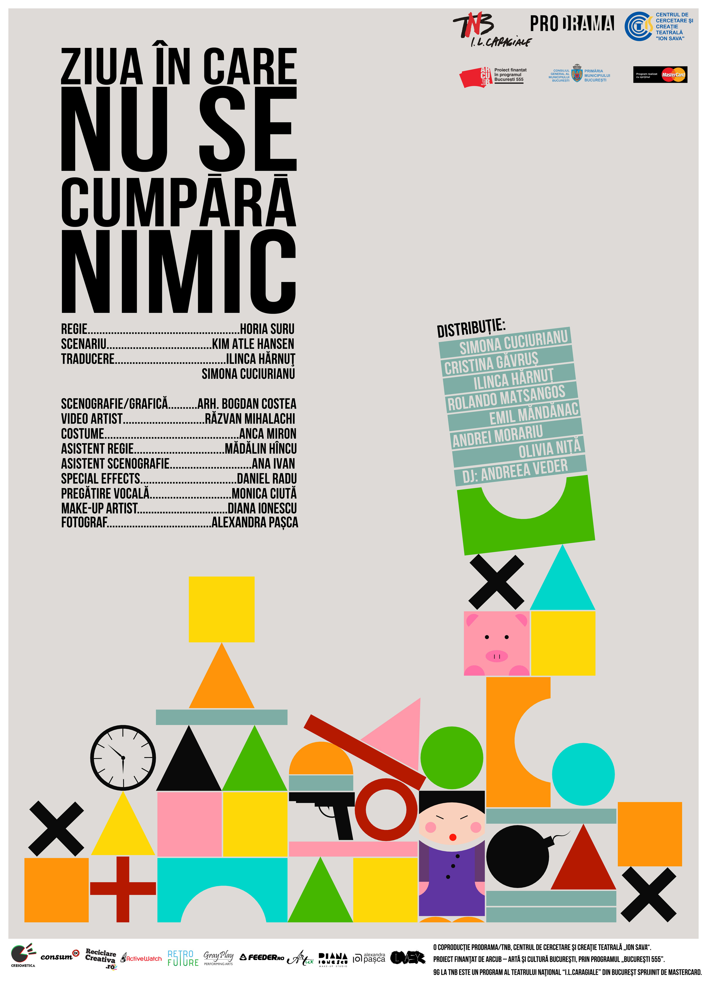 “Ziua în care nu se cumpără nimic” este povestea unor tineri care luptă pentru o lume mai bună si care au nevoie să fie ascultați. Actorii sunt atât personajele cât și naratorii vieții personajelor lor. Spectacolul explorează limitele și motivațiile implicării politice si sociale a tinerilor, văzuți într-un univers mereu proiectat, schematizat, redus la esență, o materializare a distanței pe care personajele par s-o simtă față de acțiunile lor. Ce consecinte poate avea o asemenea implicare dualista pentru cei implicati si care sunt riscurile la care se expun tinerii care iau atitudine pentru probleme sociale?